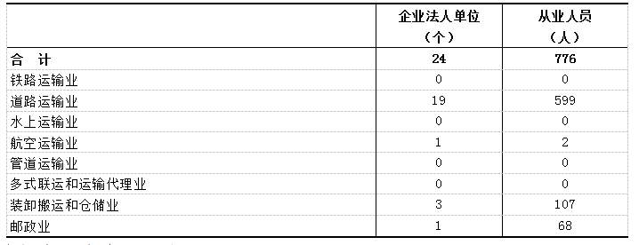 2023年末,全区共有交通运输、仓储和邮政业企业法人单位24个,从业人员776人,分别比2018年末增长71.4%和254.3%(详见表4-4)。