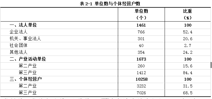 2023年末,全区共有从事第二产业和第三产业活动的法人单位1461个,比2018年末增加41个,增长2.9%;产业活动单位[1]1673个,增加76个,增长4.8%;个体经营户10258个,增加739个,增长7.8%(详见表2-1)。