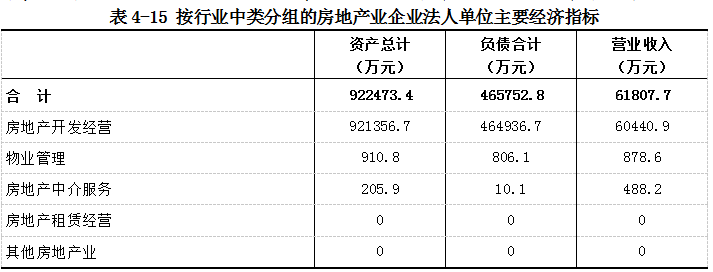 2023年末,全区房地产业企业法人单位资产总计为922473.4万元,比2018年末增长334.6%。其中,房地产开发经营企业921356.7万元,物业管理企业910.8万元,分别比2018年末增长335.2%和70.5%。房地产业企业法人单位负债合计465752.8万元,比2018年末增长402.5%。