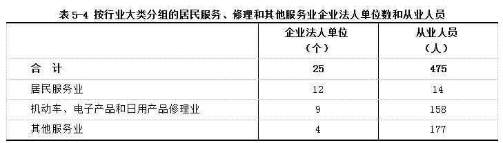 2023年末,全区共有居民服务、修理和其他服务业企业法人单位25个,从业人员475人,分别比2018年末增长316.7%和486.4%(详见表5-4)。