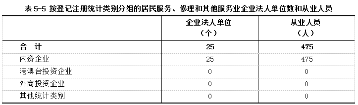 在居民服务、修理和其他服务业企业法人单位从业人员中,内资企业占100%(详见表5-5)。
