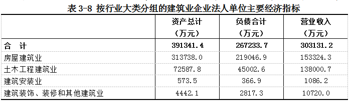 2023年末,建筑业企业法人单位资产总计391341.4万元,比2018年末增长510.6%;负债合计267233.7万元,比2018年末增长1200.0%。