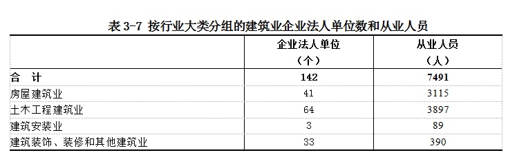 建筑业企业法人单位从业人员中,房屋建筑业占41.9%,土木工程建筑业占52.5%,建筑安装业占0.4%,建筑装饰、装修和其他建筑业占5.2%(详见表3-7)。