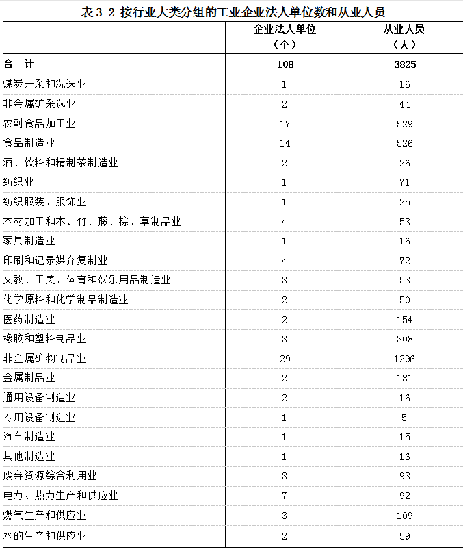 在工业企业法人单位从业人员中,采矿业60人,制造业3505人,电力、热力、燃气及水生产和供应业260人,分别占1.6%、91.6%和6.8%。在工业行业大类中,非金属矿物制品业,农副食品加工业,食品制造业从业人员数位居前三位,分别占33.9%、13.8%和13.8%(详见表3-2)。