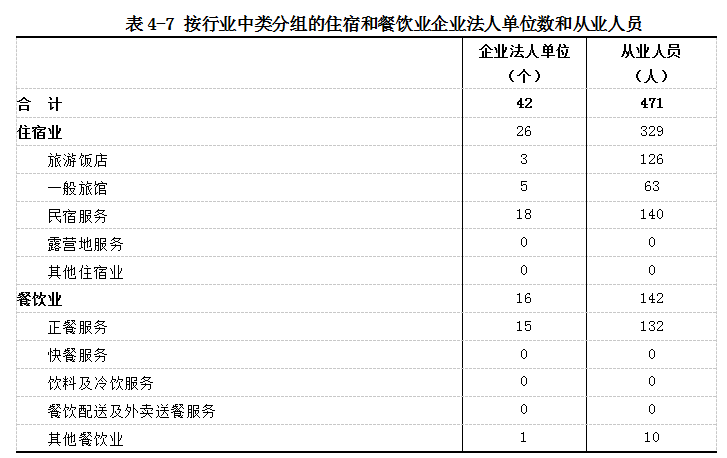 2023年末,全区共有住宿和餐饮业企业法人单位42个,从业人员471人,分别比2018年末增长162.5%和276.8%。
