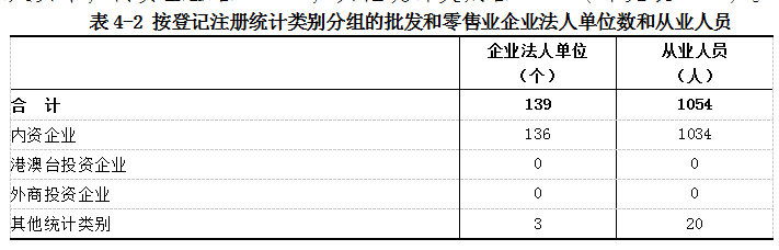 在批发和零售业企业法人单位从业人员中,内资企业占98.1%,其他统计类别占1.9%(详见表4-2)。