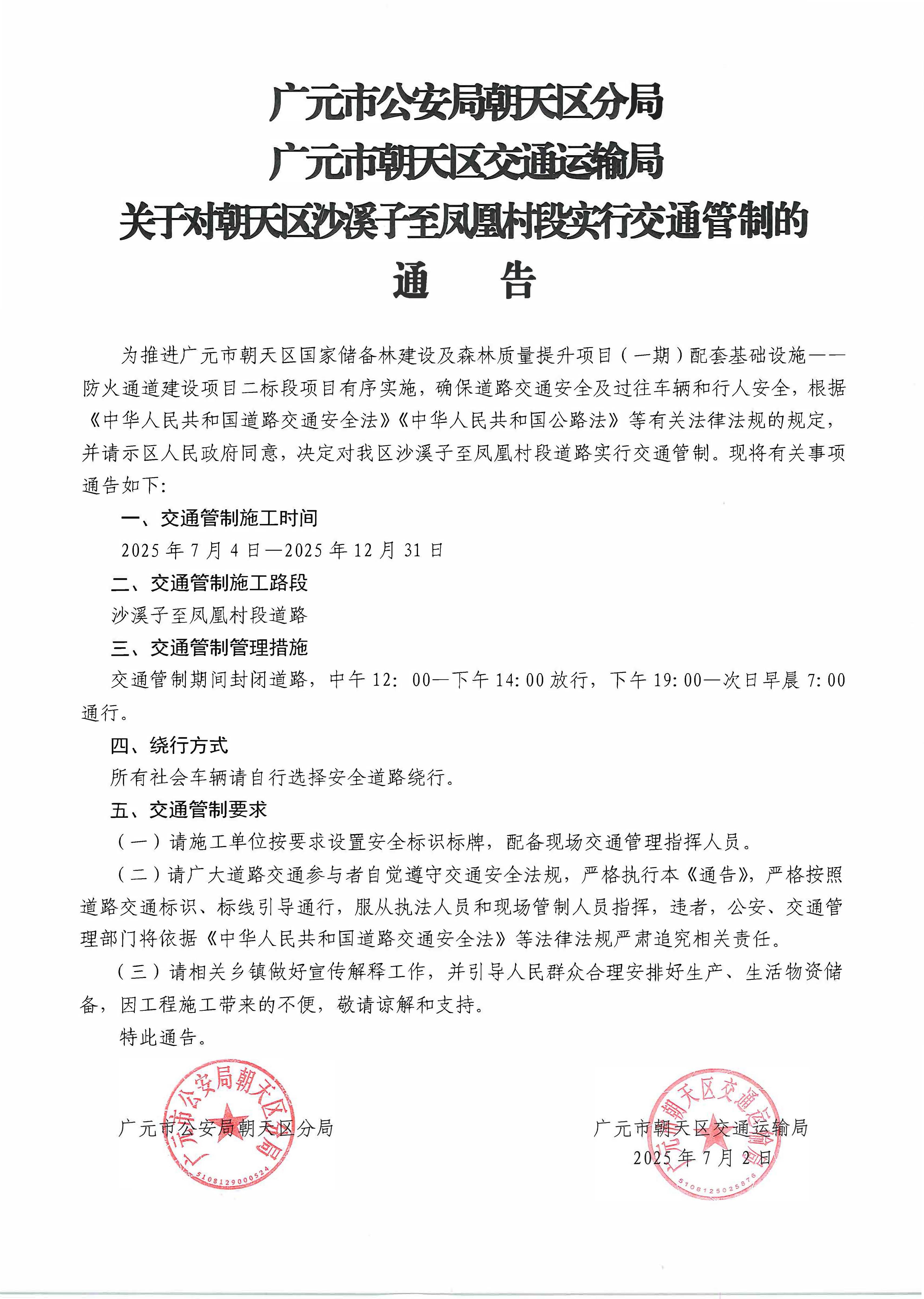 关于对朝天区沙溪子至凤凰村段实行交通管制的通告