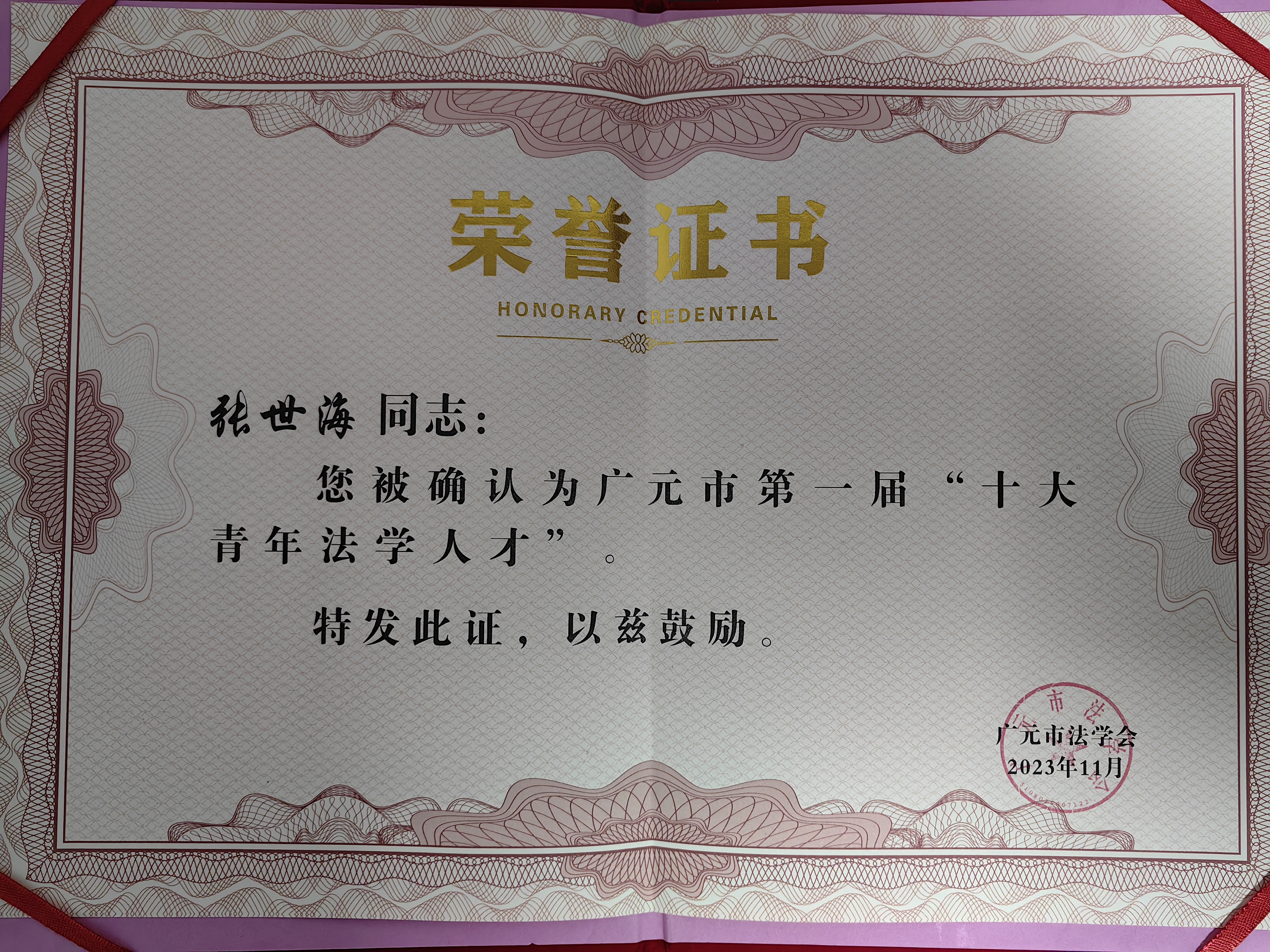 张世海广元市第一届“十大青年法学人才”称号