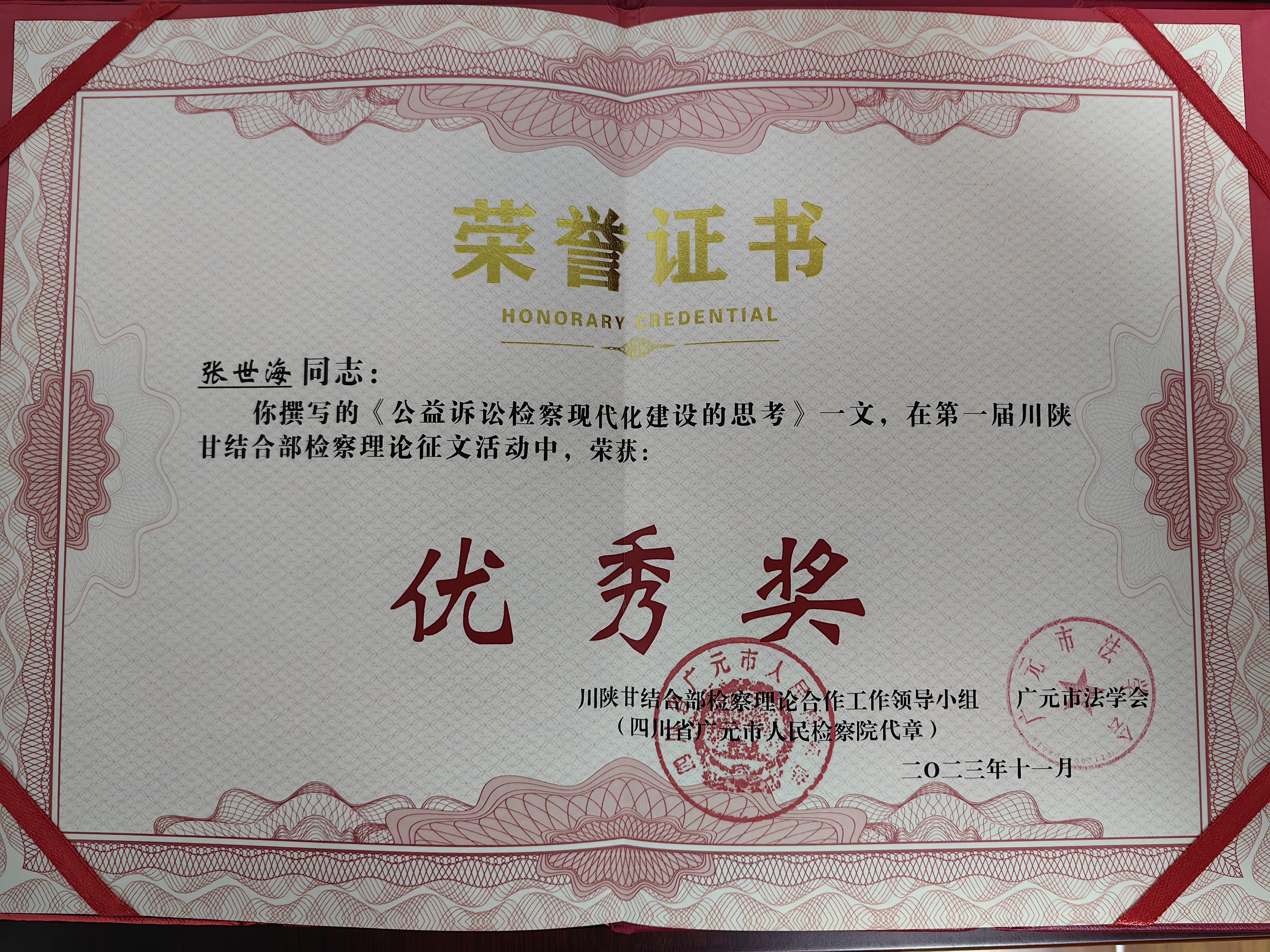 在11月28日揭晓的第一届川陕甘结合部检察理论征文活动获奖名单中。朝天区人民检察院副检察长张世海撰写的《公益诉讼检察现代化建设的思考》论文,荣获第一届川陕甘结合部检察理论征文活动优秀奖!