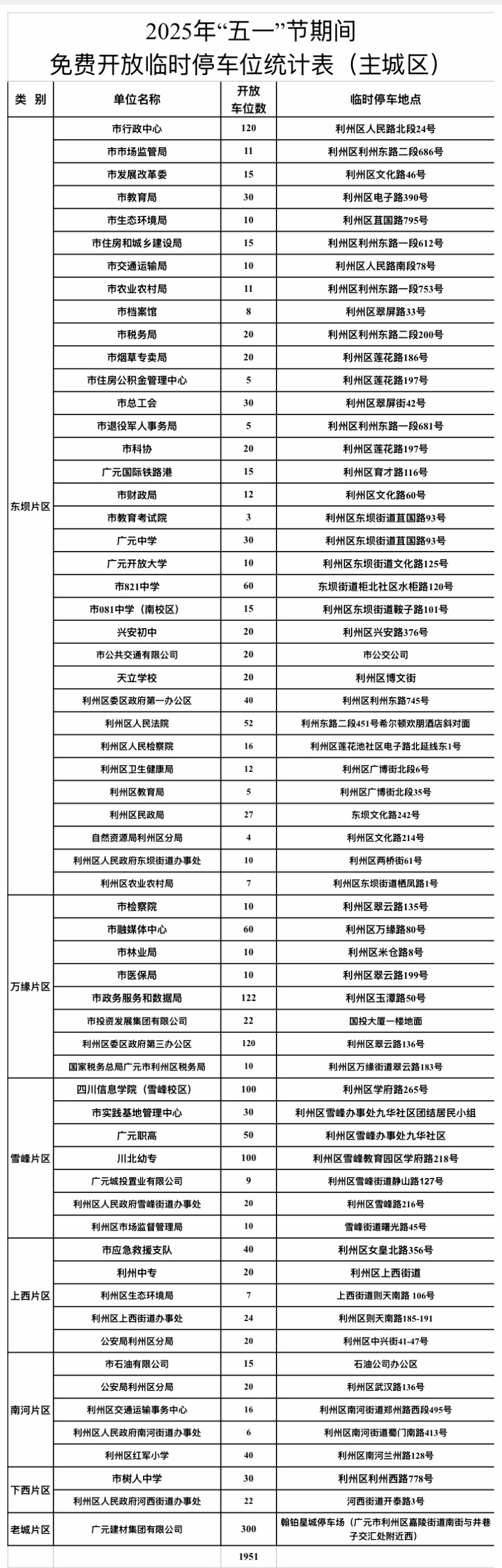利州区(主城区)车位具体位置和开放单位名单如下: