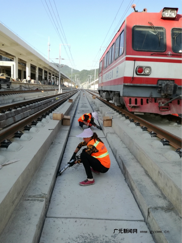 5月8日,两位女工正在为西成客专朝天站站内无砸轨道板间伸缩缝注胶。