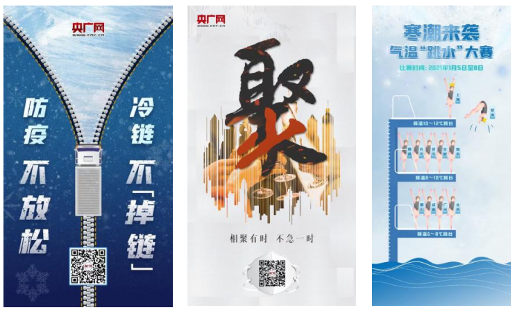 央广网在这方面开拓思维,做出了不少匠心十足的创意产品。《防疫不放松 冷链不“掉链”》中巧用双关的文字玩法,将“冷链”与“拉链”联系在一起,构思巧妙,别出心裁;《相聚有时 不急一时》以“聚”字的笔画结构为创意出发点,传递“少聚集”的概念;《寒潮来袭 气温“跳水”大赛》则是通过拟人化的表现形式,模拟各城市温度变化,新奇有趣,令人印象深刻。