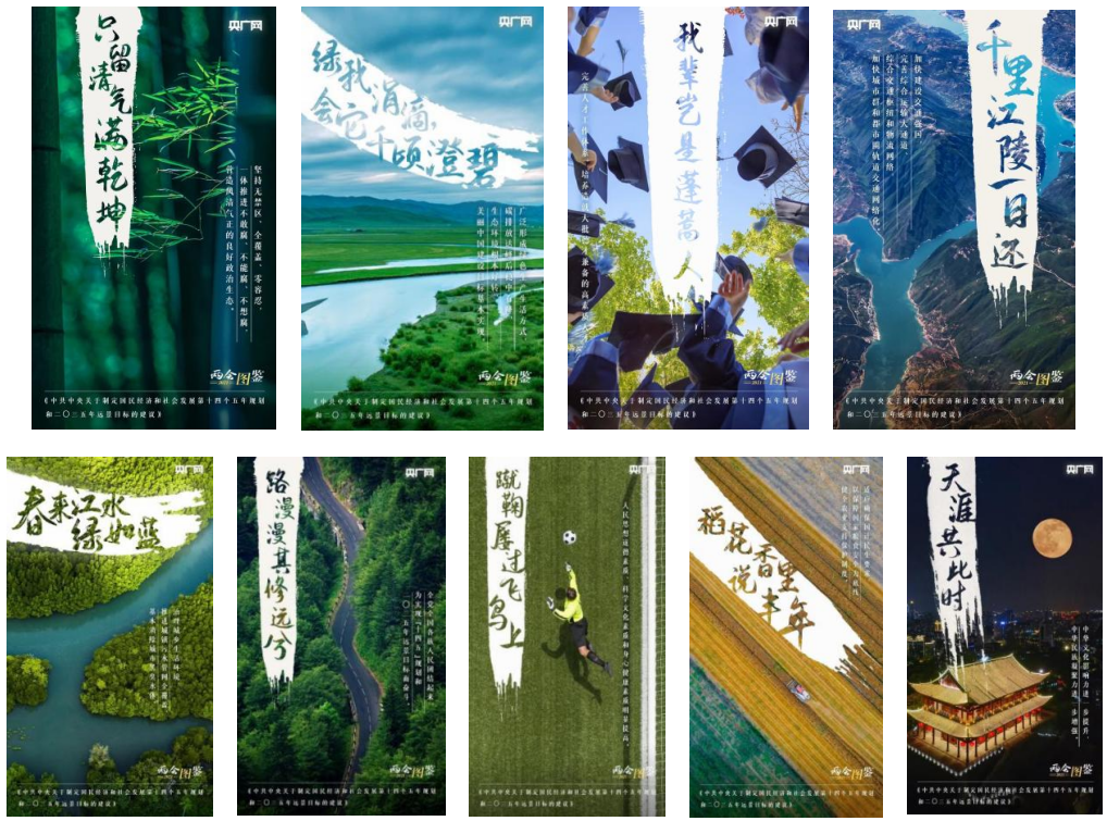 由单张海报延伸出的系列组图,主题、色调、风格整齐划一,能够利用多图集中优势进行“团队作战”,实现能量叠加效果。《政府工作报告,这些话暖心又提气!》《一组数据了解2021中国KPI》通过提炼政府工作报告中的重点内容,将碎片化信息汇聚成系列,提升了信息的完整度;春节期间,央广网在全端口推出的系列海报《犇!》以“奋斗牛”“老黄牛”“拓荒牛”“孺子牛”“知足牛”“逍遥牛”六个形象,共同组成了新时代的精神画像。