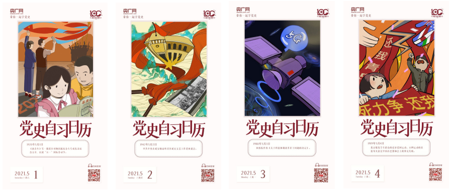 原创策划产品《党史自习日历》就赋予了海报更多的多媒体属性。在这组可以“听”的海报中,每张海报都有一个独特的二维码,扫码即可进入收听页面,获取更丰富的信息。产品充分发挥了央广网的特色声音资源优势,学史明志,放眼未来,富有鲜活的时代感。