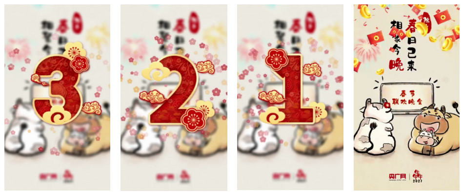 《犇!》手绘除夕海报加入数字倒计时和散落的烟花、红包、元宝等元素,在声音和动态效果的加持下,原本的静态图片升级为10秒钟的短视频,调动起受众的感官联想,营造出喜庆、祥和、团圆的过年气氛。