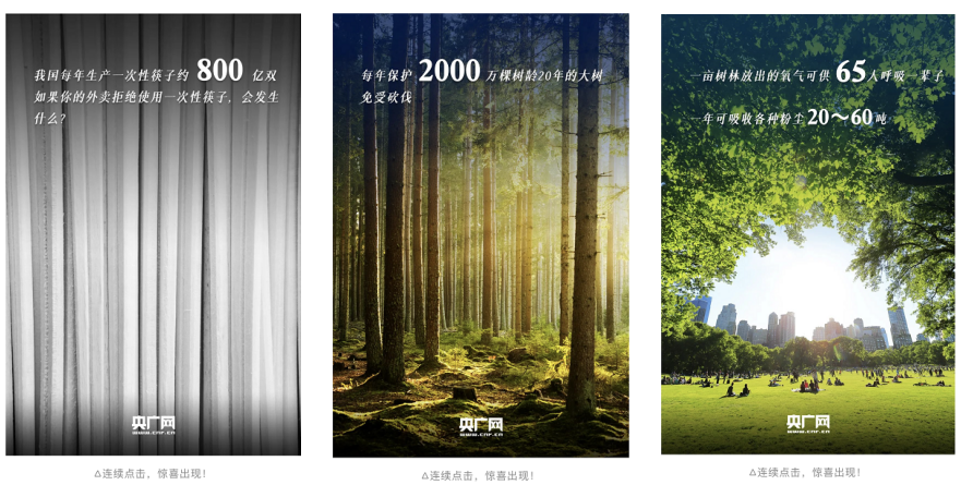 基于SVG技术的网页可视化视觉符号交互,能够创造拟态化的话语空间,增强沉浸感和参与感。央广网在3月12日植树节推出的公众号文章《如果你今天的外卖不用一次性筷子,会发生什么?》中,用户点击单张图片,即可实现画面的动态切换。从黑白到彩色,从贫瘠干枯的土地到绿树成荫,这种视觉过渡让用户仿佛亲自参与到了“绿色奇迹”中,也将“环境保护”的主题更好地传递出来,与传统的图文叙述相比,更加直观、醒目、深入人心。