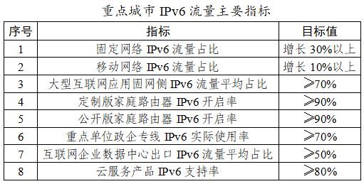 用一年左右的时间,大型互联网应用IPv6放量引流规模进一步扩大,家庭路由器IPv6开启率大幅提升,重点单位政企专线IPv6实际使用率明显提高,数据中心承载业务全面完成升级改造并对外提供IPv6服务,云服务产品IPv6支持率持续提升。重点城市固定网络和移动网络IPv6流量占比明显提升,重点城市大型互联网企业、终端设备企业、云服务平台等IPv6升级改造有效带动全国各地区IPv6流量提升。