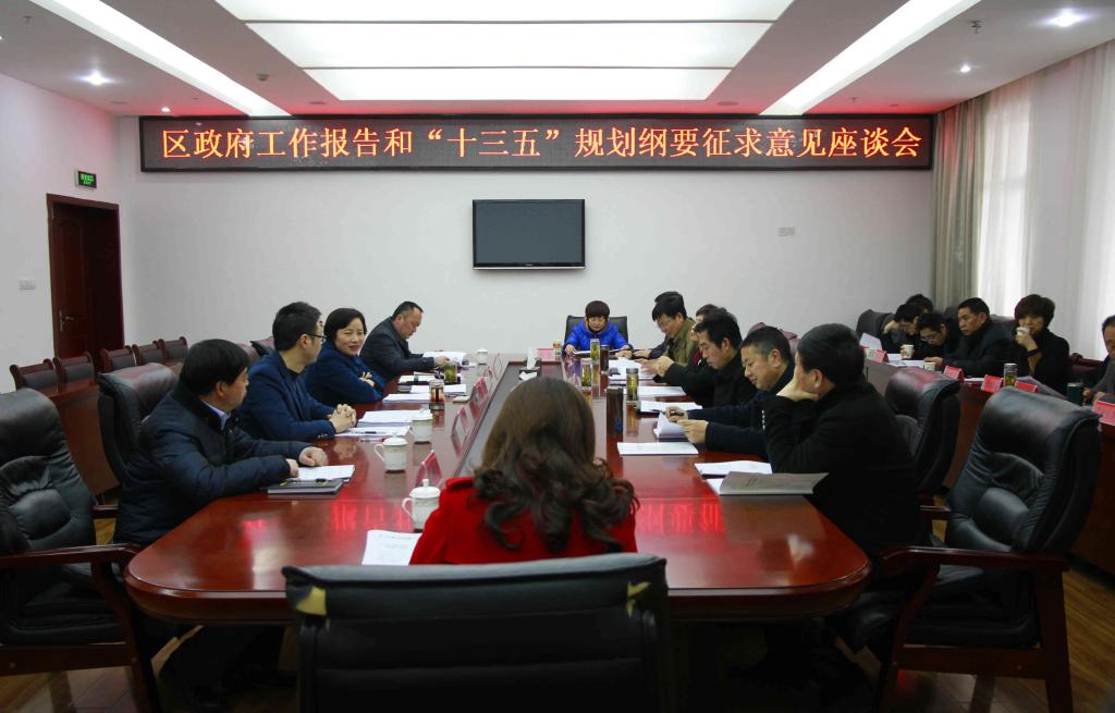 区政府办、区发改局分别就《区政府工作报告(征求意见稿)》和《“十三五”发展规划纲要(征求意见稿)》的起草情况作了说明。与会人员围绕《区政府工作报告(征求意见稿)》及《“十三五”发展规划纲要(征求意见稿)》,结合我区实际展开热烈讨论,就2016年及“十三五”时期我区经济社会发展积极建言献策。大家一致认为,《政府工作报告(征求意见稿)》全面总结了我区“十二五”期间和2015年的工作,总结成绩实事求是,分析问题客观准确,谋划未来发展和今年工作重点突出,符合全区经济社会发展实际。“十三五”发展规划纲要(征求意见稿)谋篇布局合理、结构完整、思路清晰、任务明确,具有很强的指导意义。同时,与会人员还围绕工业发展、旅游商贸、项目建设、特色产业、基础设施、脱贫攻坚等方面工作提出了中肯的意见和建议。