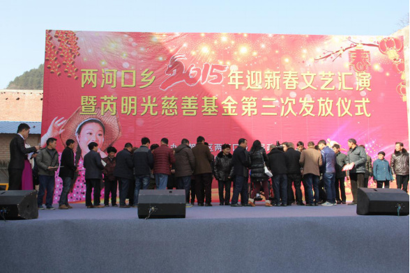 真心敬老。锐锋公司于2012年成立了“锐锋敬老基金”,从2013年开始对两河村60岁以上老人发放敬老金,并且每年将新满六十岁的老人动态纳入,并为每个老人办理敬老卡,老人们在年底凭卡领钱,2013——2016年共计发放养老金、物资150人次,累计资金50万元,2015开始将帮扶范围扩大到全乡范围内的困难老人。两河口乡领“锐锋敬老金”年龄最大的老人杨春礼已有102岁,自2013年以来杨春礼老人和老伴已连续4年在芮明光手中接过60000余元的敬老金。两河村5组杨开义夫妇因病又无儿女供养被评为建卡贫困户,他们除了每月低保金外无任何收入来源,芮明光每年除了给他们发放2400元敬老金,还每年为他们每人提供600元的资助。在两河村,在老人们心目中,芮明光比自己的儿子还亲,而芮明光也说老人们都是自己亲人。