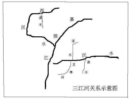 西汉水是嘉陵江西侧的支流,发源于甘肃省天水市西秦岭的仁寿山,向西、向南、向东南绕一大圈后于陕西省略阳县两河口汇入嘉陵江。嘉陵江发源于陕西省凤县东北秦岭南麓的凉水泉沟,向南流依次纳入西汉水、白龙江等等支流,在重庆市汇入长江。汉水又名汉江,亦发源于秦岭南麓的沮水,经勉县、汉中市向东流去,在武汉市汇入长江。汉水发源地离嘉陵江不远,但有秦岭和巴山相连处山峰的相隔而流向不同。这是客观存在的水文地理形势,但在中国古代的历史和地理典籍中,这三条江河的名称还有些“扯不清”的关系。