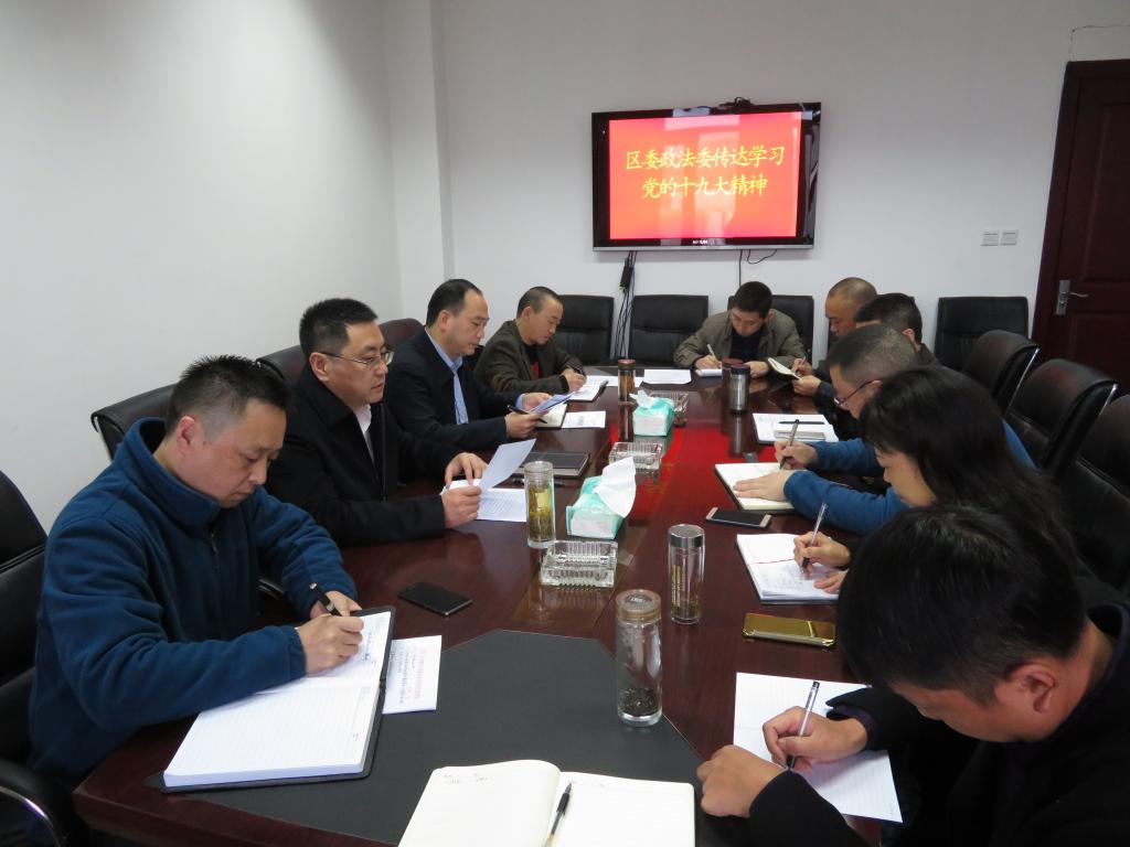 11月1日上午,区委常委、区委政法委书记李绍兵组织召开区委政法委机关全体党员干部会议,深入学习贯彻党的十九大会议精神,以及省、市、区传达学习党的十九大相关会议精神。