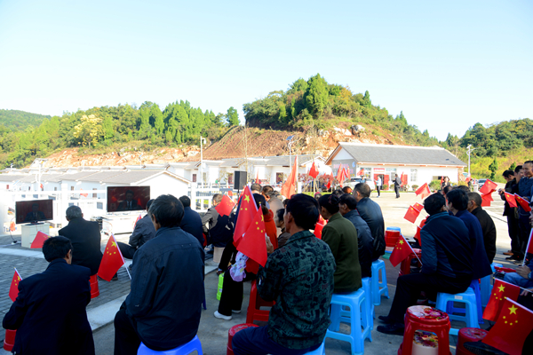 蒲家乡罗圈岩村群众入住新房,在安置点广场集中收看十九大开幕盛况