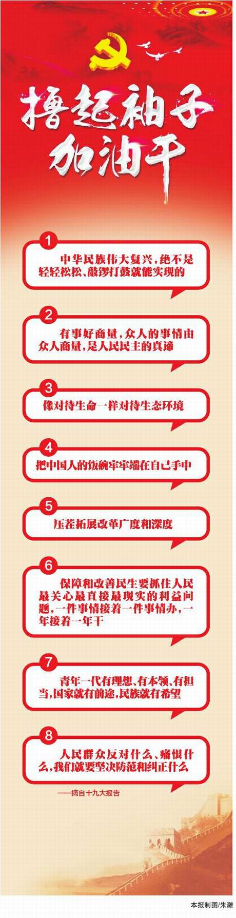 大白话非常具有说服力和感染力。本报梳理出十九大报告中的部分大白话,邀请党代表和专家学者结合工作实际,共同学习思考领会。大家认为,大白话来自于城市农村、田间地头、工厂车间,对推进脱贫攻坚、创新创造、绿色发展等具体实践有很强的指导意义。用好大白话,不能停留在口头上,要举一反三地运用在推动发展的广阔天地中,引领大家撸起袖子加油干。