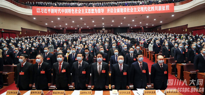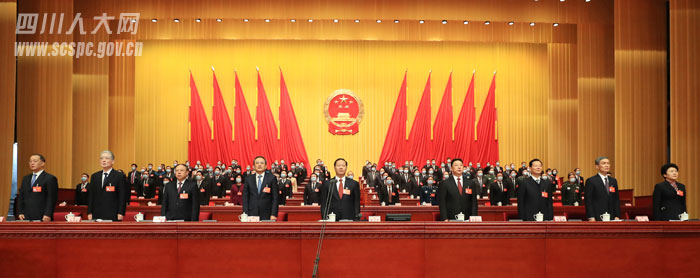 上午9时,彭清华宣布:四川省第十三届人民代表大会第四次会议开幕!全体起立,奏唱中华人民共和国国歌。