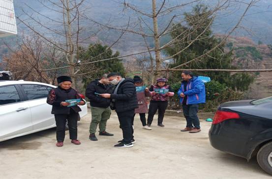 镇人大代表、黎明村村主任文帮朝为川陕结合部的群众发放疫情防控宣传资料。